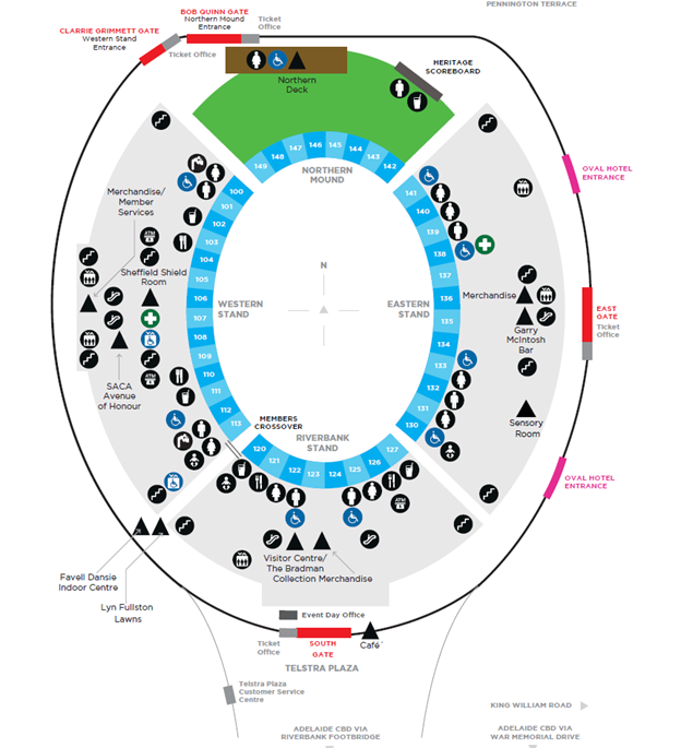 - Adelaide Oval has both ramps and lifts throughout the venue to provide safe access for wheelchair or mobility impaired visitors. Ramps are located near all stairs and lifts are located near all escalators. Please refer to Appendix B on page 5 of this document for details.