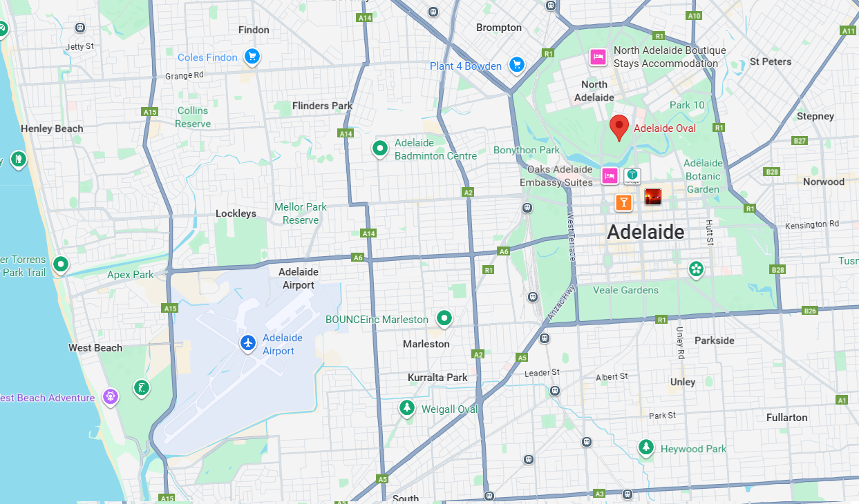 Adelaide Airport is only 8km from Adelaide Oval – just 15 – 20 minutes by car. Ubers and Taxis can be readily attained at the airport and will cost around $25-30. There is also a bus service travelling between the airport and Adelaide Oval and timetable information can be found here.